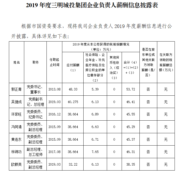 2019年度三明城投集团企业负责人薪酬信息披露表