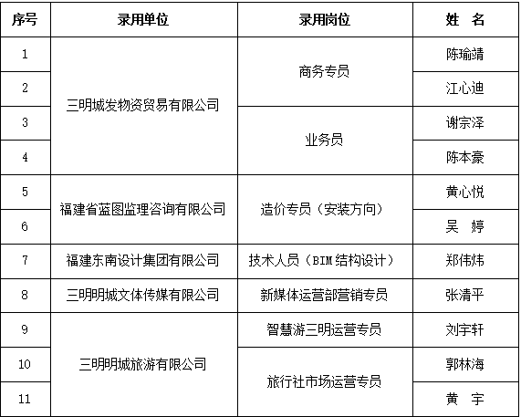 根据市城发集团2024年3月29日发布的招聘公告,通过报名、资格审查、面试、笔试等程序,现将拟录用人员名单公示如下: